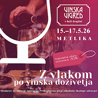 Od Železniške postaje Metlika do zgodovinskega mestnega jedra, ki je hkrati prireditveni prostor 44. tradicionalne vinsko-turistične prireditve, vas loči le slab kilometer prijetnega sprehoda. Pred vstopom na Plac vas pred Galerijo Kambič sprejme vodnik in popelje skozi dragoceno in nacionalno pomembno zbirko del slovenskih likovnih umetnikov. Sledi sprehod po mestnem jedru in sprejem v lokalno butični trgovinici, Hiši dobrot Bele krajine. Tukaj so doma belokranjske dobrote, od katerih boste okusili metliško črnino ali sok, domač sir in orehe. Ogledali si boste tudi razstavo Društva kmečkih žena Metlika in se naučili peči evropsko zaščiteno belokranjsko pogačo. Nato boste zavili v prostore metliškega gradu, v Belokranjski muzej, ki vas bo s svojimi bogatimi stalnimi razstavami popeljal po bogati belokranjski zgodovini. Sledil bo prosti čas za potepanje po največjem vinskem festivalu v Sloveniji, kjer ne bo manjkalo dobre vinske kapljice, odlične belokranjske kulinarike, plesa in glasbe. Izlet lahko zaključite na turistični kmetiji ali gostišču, kjer vam bodo postregli pristno belokranjsko hrano. V metliškem mestnem jedru se s svojimi najboljšimi nagrajenimi vini širšemu občinstvu predstavijo belokranjski vinogradniki. Bogata ponudba vin vas čaka tudi v Hiši dobrot Bele krajine. Vse tri dni festivala poteka bogat kulturni in zabavni program. Dobrodošli.